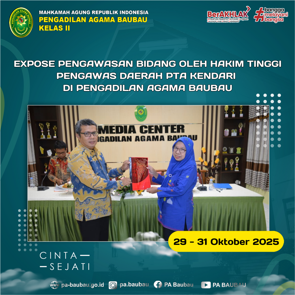 Baubau, 31 Oktober 2025. Telah dilaksanakan Expose Hasil Pembinaan dan Pengawasan Bidang Oleh Hakim Tinggi Pengawas Daerah PTA Kendari & Tim di Pengadilan Agama Baubau. Tim Hatiwasda yang dipimpin oleh Dra. Tumisah menyampaikan sejumlah temuan dan rekomendasi hasil pemeriksaan yang telah dilakukan sebelumnya dari tanggal 29 – 31 Oktober 2025. Adapun aspek yang diawasi meliputi manajemen peradilan, administrasi perkara, administrasi persidangan, administrasi kesekretariatan, serta manajemen pengaduan dan kinerja pelayanan publik.