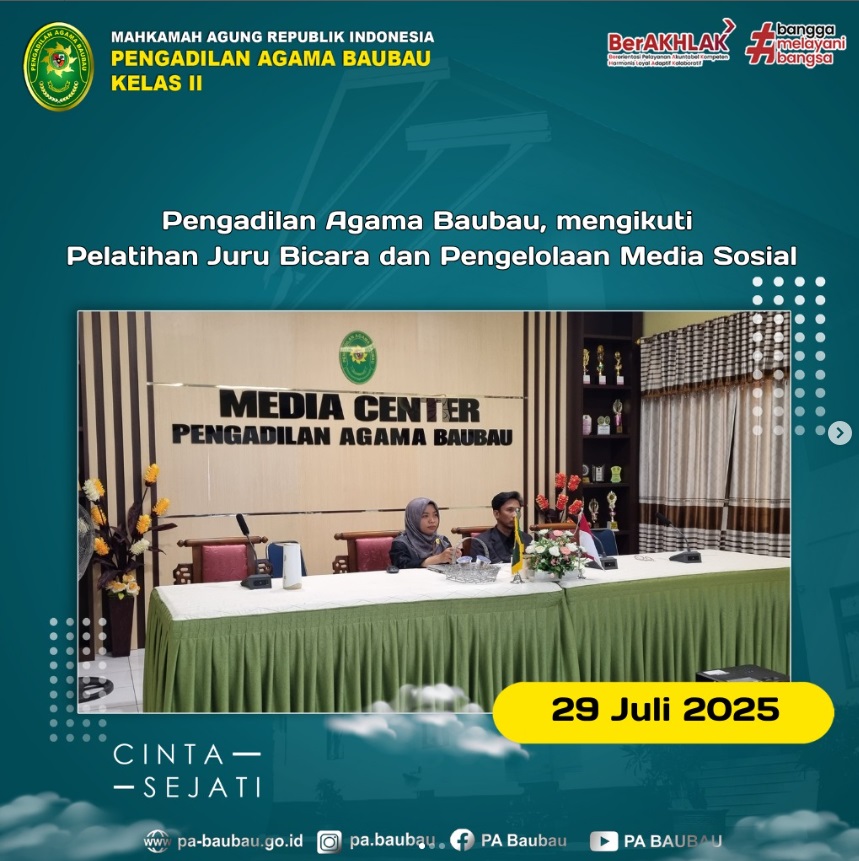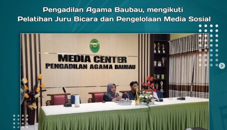 Baubau, 29 Juli 2025. Pengadilan Agama Baubau mengikuti Pelatihan Juru Bicara dan Pengelolaan Media Sosial pada 4 (empat) lingkungan peradilan di seluruh Indonesia secara daring melalui Zoom Meeting. Kegiatan ini diikuti oleh Juru Bicara, Tim Humas, Panitera Muda Hukum, Pengelola Media Sosial, serta Pegawai yang aktif di media sosial.