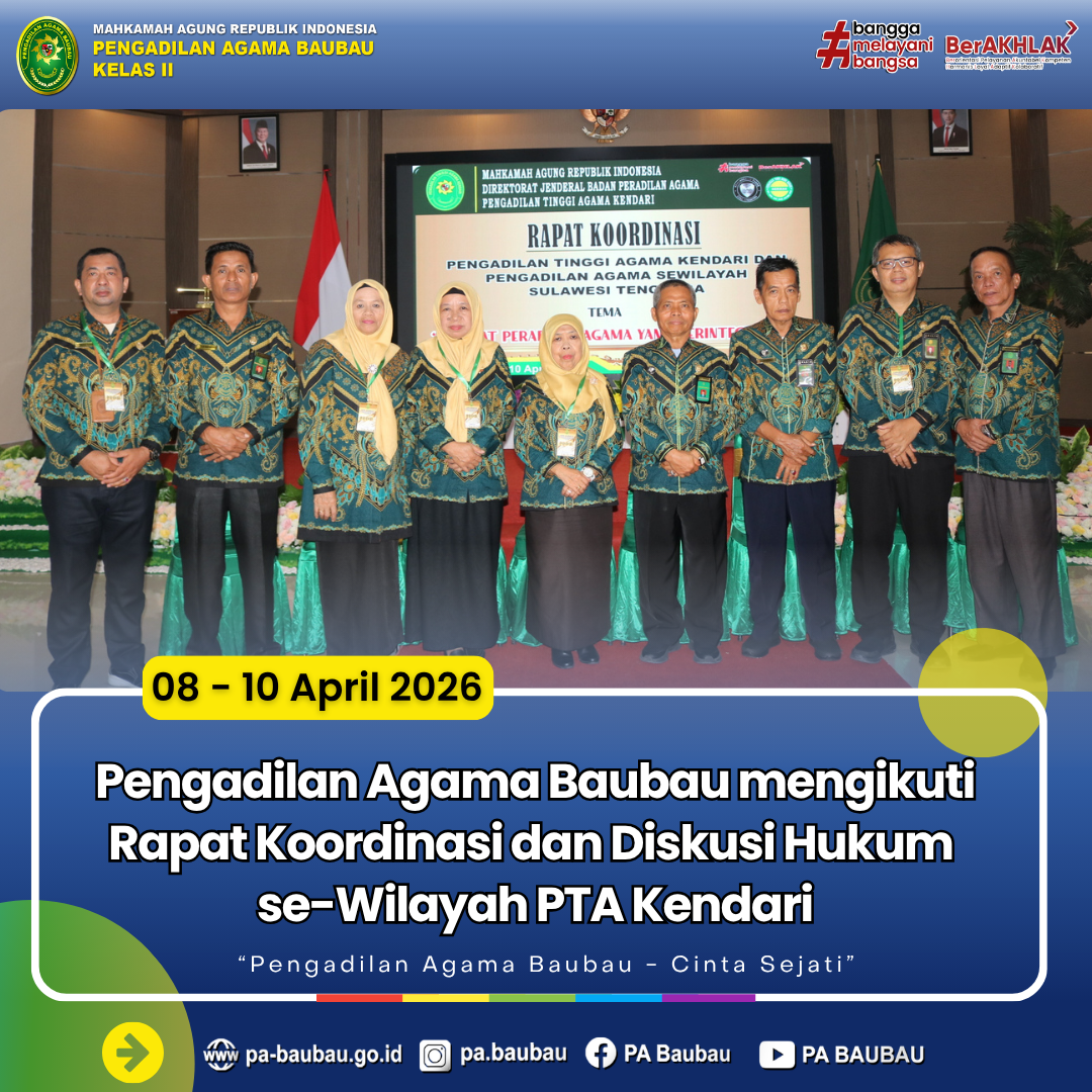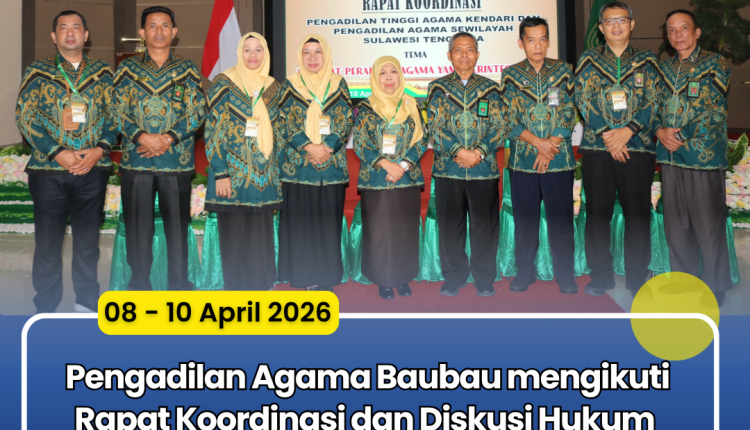 Kendari, 8–10 April 2026 . Dalam rangka meningkatkan koordinasi dan sinergi antar Pengadilan Agama di wilayah hukum Pengadilan Tinggi Agama Kendari, Pengadilan Agama Baubau menghadiri kegiatan Rapat Koordinasi (Rakor) dan Diskusi Hukum yang diselenggarakan di Kendari.